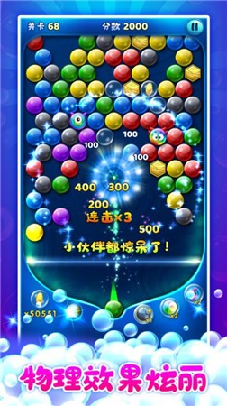 成百上千个极具挑战的关卡,各种玩法模式,让你玩到根本不像停的泡泡龙游戏。只需一遍就会知道这款游戏怎么去操作,老少皆宜,更有各种物理效果呈现非常的绚丽。